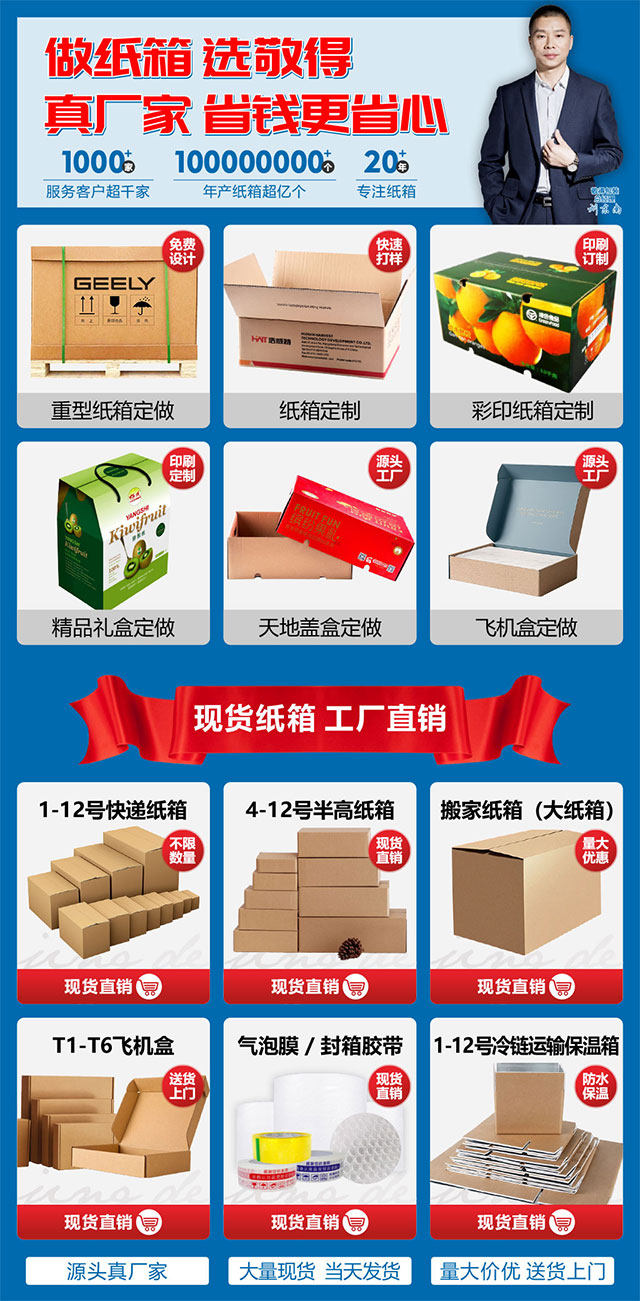 敬得包装(湖南)有限公司,坐落在环境优美交通便利的长沙市望城区,是一家纸箱、重型纸箱、超大尺寸纸箱、大型工业品包装、防水铝膜冷链保温箱、彩箱、礼盒、彩盒、快递纸箱等包装产品的生产厂家。配备高速四色水墨印刷机、超大尺寸印刷圆模印刷机、全自动模切机、贴面机、全自动粘钉一体机、全自动粘盒机、全自动订箱机、压型机、重型打钉机等包装生产设备。