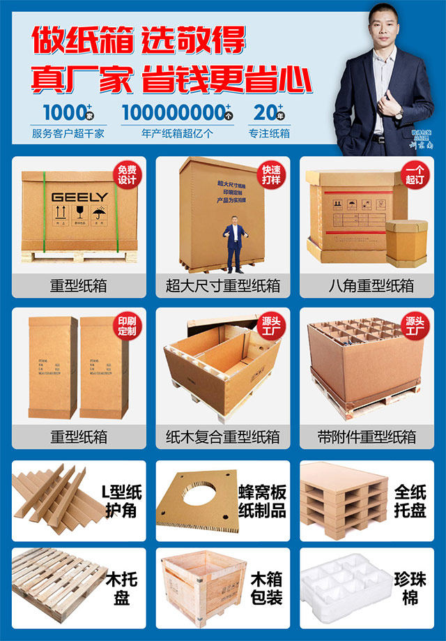 敬得包装是集研发、设计、打样、生产、销售、服务为一体的重型纸箱包装生产企业,生产的重型纸箱包装产品不仅抗压承重能力强,防潮性能好,能很好的保护您的产品。重型纸箱作为木箱、蜂窝纸箱、铁箱、塑料箱、纸桶等包装的优化最佳替代包装产品。广泛使用于各领域如:汽车零部件、金属部件、摩托车、航空航天产品、医疗器械、军工产品、机柜、通信设备、精密仪器、新能源电池材料、机械设备、粉剂、流体等各类产品。