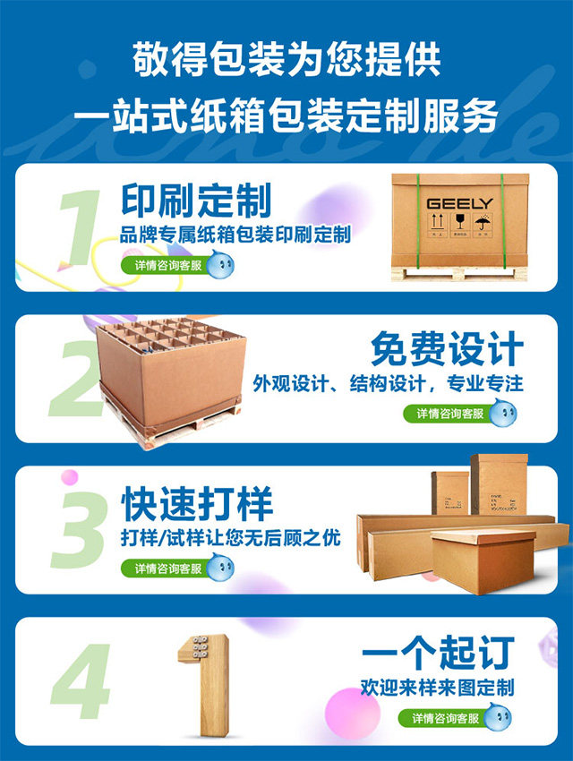 敬得包装立足湖南,重型纸箱畅销全国各地市场,专业技术团队提供整体解决方案,1个起订,让您试用后无后顾之忧。设备齐全,拥有大型包装生产设备,可做超大尺寸纸箱。